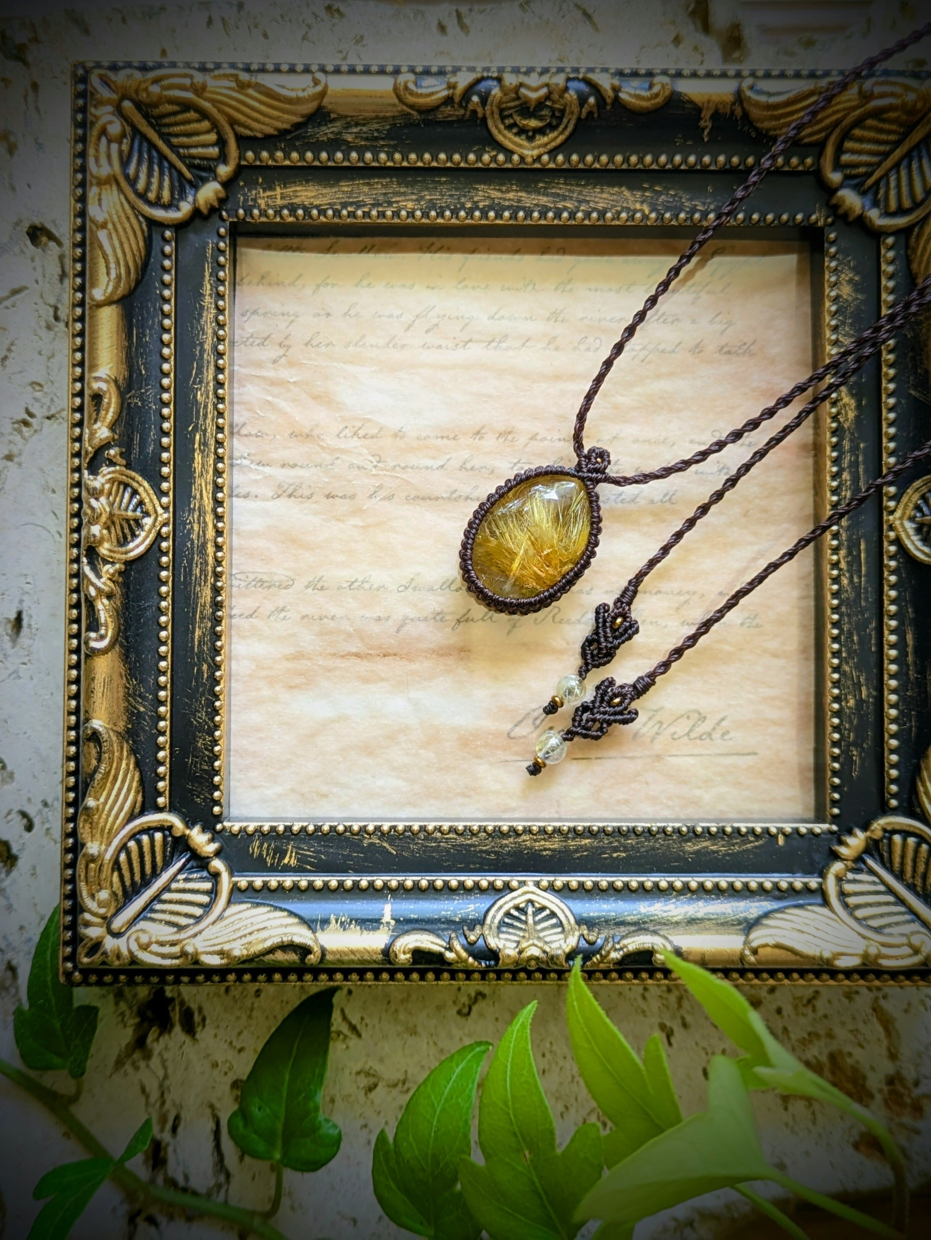 調節可能なネックレス紐の先には、同じくルチルクォーツをあしらってみました。背中にそのまま下げられても、前に持ってこられてご着用いただいてもお顔まわりがより華やかになるかと思います。