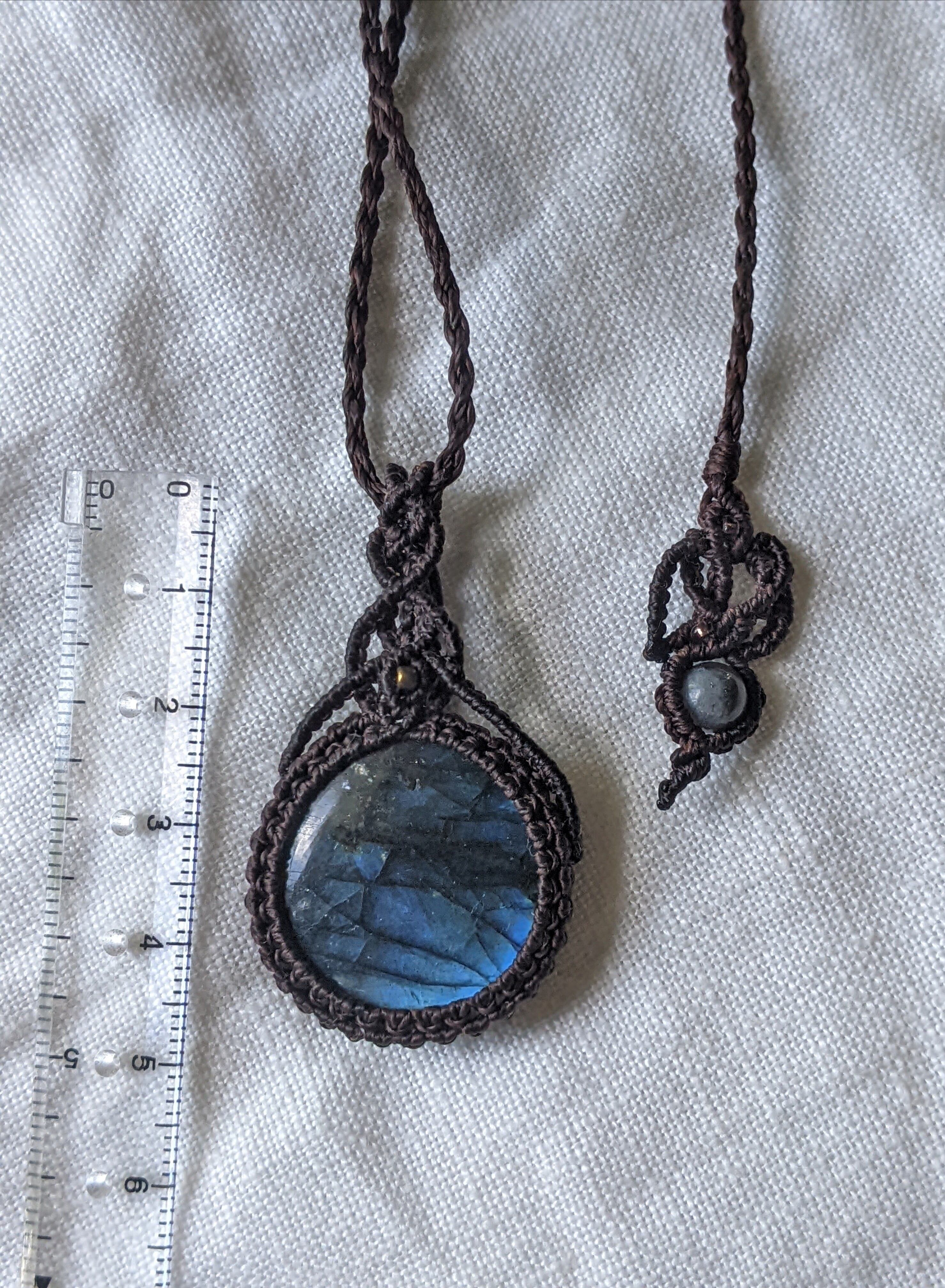 丸く、優しい印象のラブラドライトを 流れるようなラインを意識して組んでみました。ネックレス紐の終わりには、ブラックラブラドライトを配し、紐は全長約84cmと長めです。お好みの長さにサイズ調節が可能ですので、チョーカー風にも、ロングペンダントとしても お洋服に合わせてアレンジ出来るかなと思います。