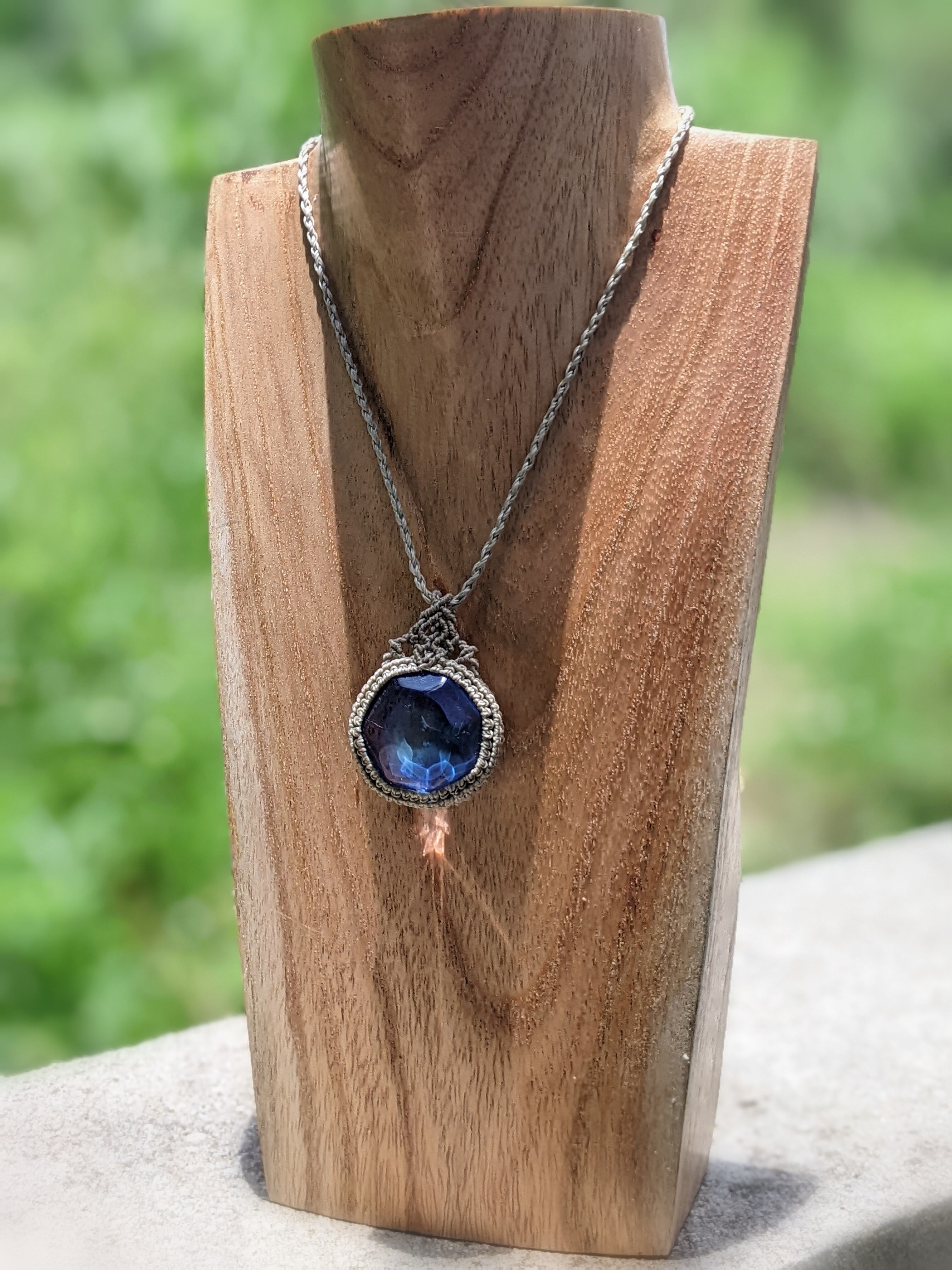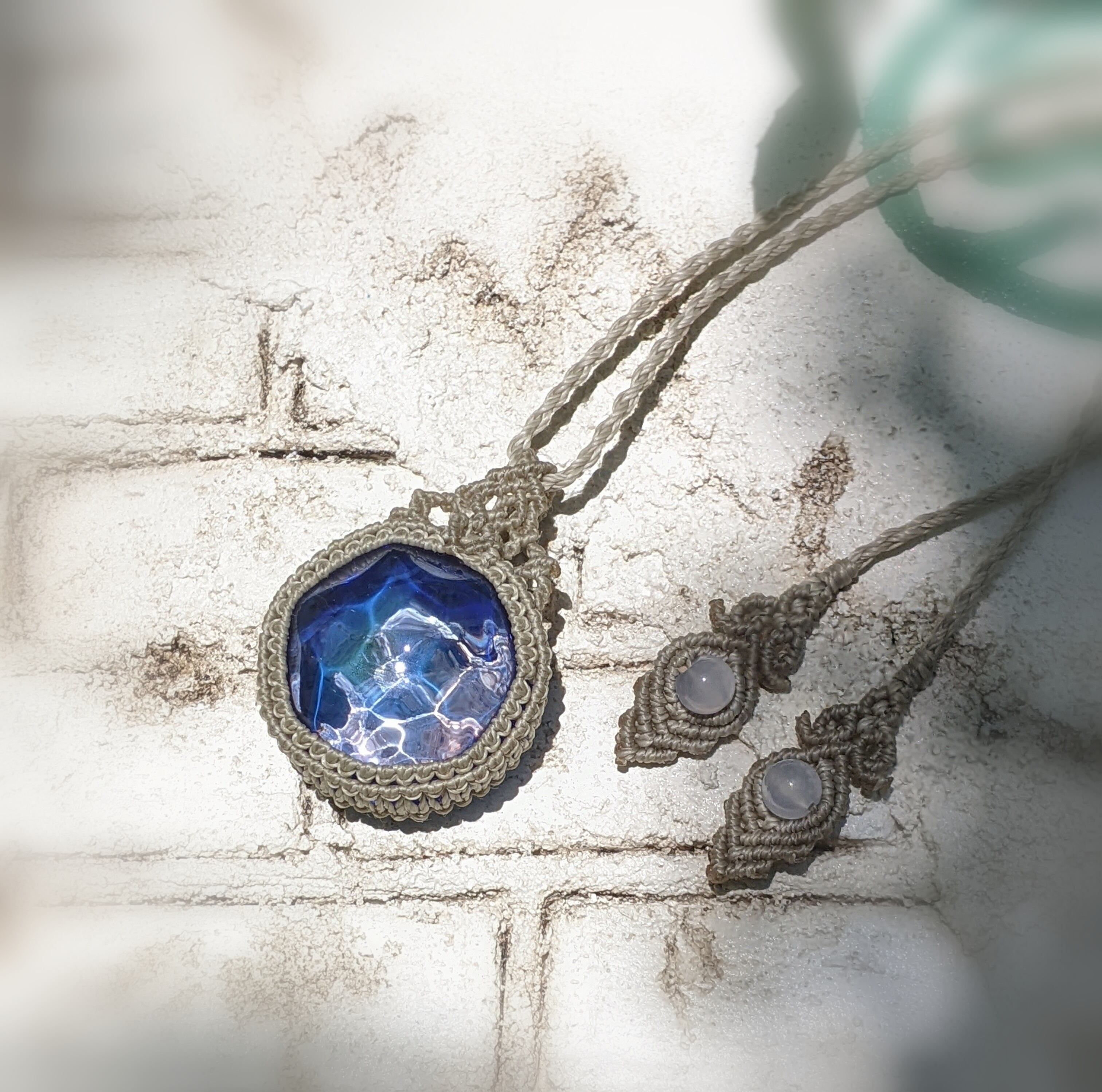そして、ネックレス紐は、男性の方が着けられましてもゆとりのある 最長約 84cmとし、終わりの飾り編み部分には カルセドニーを配しました。このカルセドニーは、とても穏やかなエネルギーを持つ石で、人と人との縁を繋ぐ役割を果たすと言われております。また、人間関係で疲れてしまった気持ちを穏やかに整えてくれるでしょう。