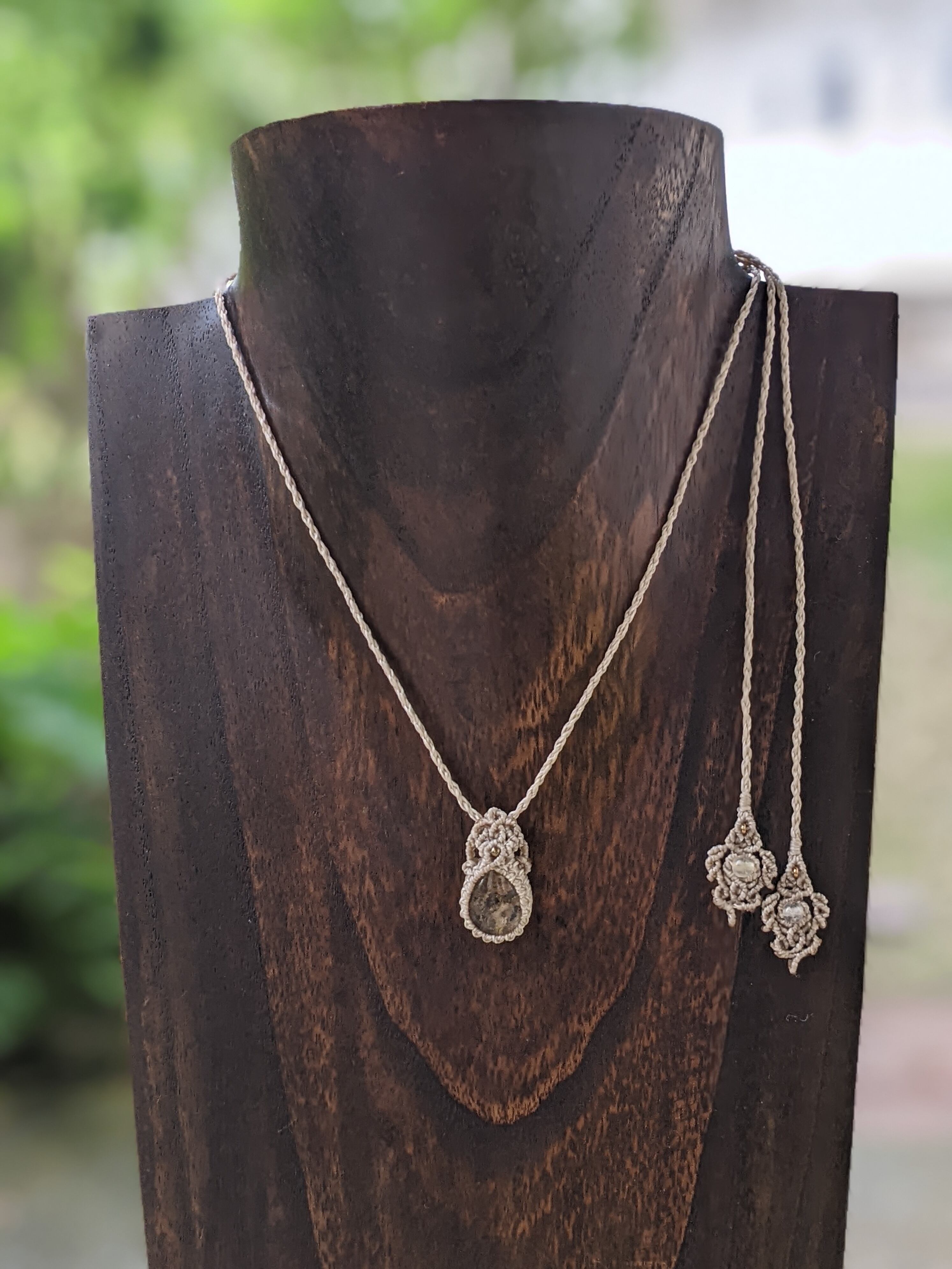 アイボリー系のインクルージョンが 優しい印象のクォーツを、ペンダントにいたしました。お石自体の大きさは、縦約 1.7cm 横幅約 1.3cmの 小ぶりなサイズです。肌馴染みの良いベージュ系のコードでお仕立ていたしました。主張し過ぎないサイズで お洋服を選ばす ご着用頂けるのではないかなと思います。ネックレス紐の終わりの部分にはルチルクォーツを配しております。また、金属を含みませんので 金属アレルギーをお持ちの方も安心してご着用頂ける上、ネックレス紐は サイズ調節が可能で、チョーカー風にもお楽しみ頂けます。