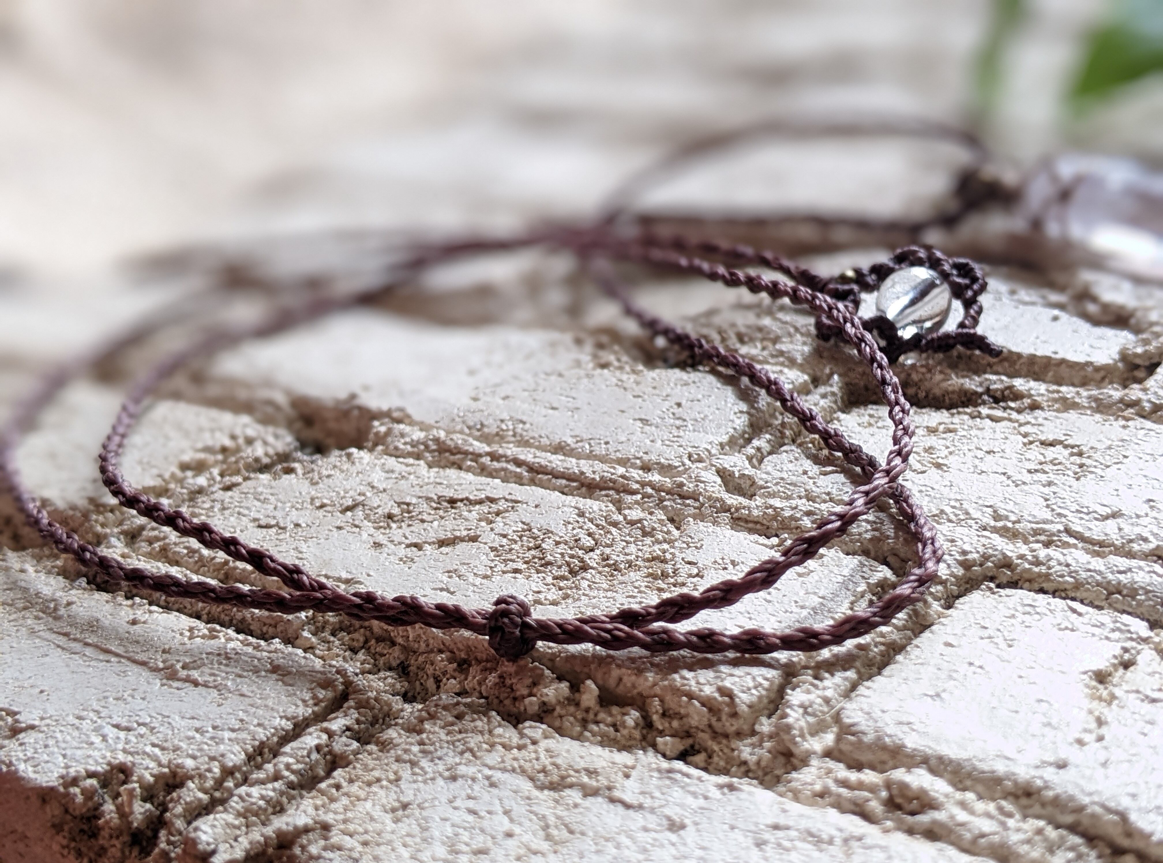 こちらは、石自体の大きさが、長さ約2.3cmと 小ぶりな為、トップは0.25mmの極細なコードで仕立てております。ネックレス紐の終わりには ブラジル産クリアクォーツを配し、背中側にも 華やかさを添えてみました。